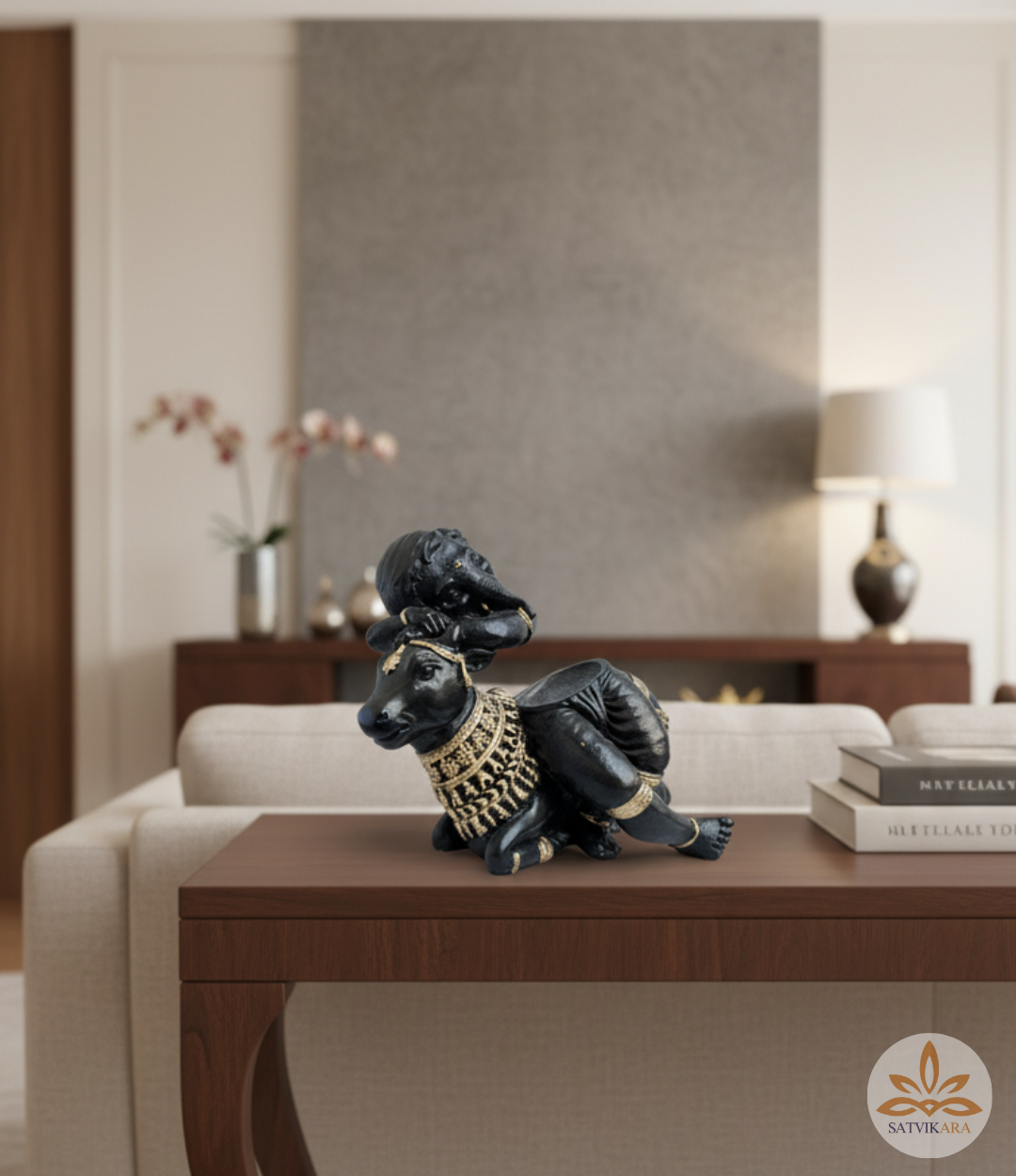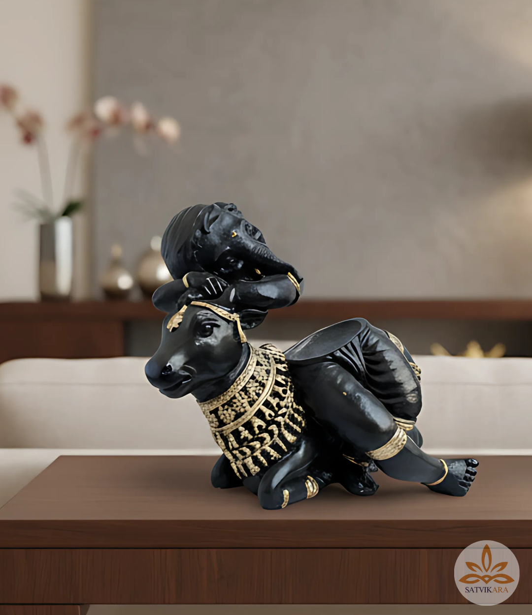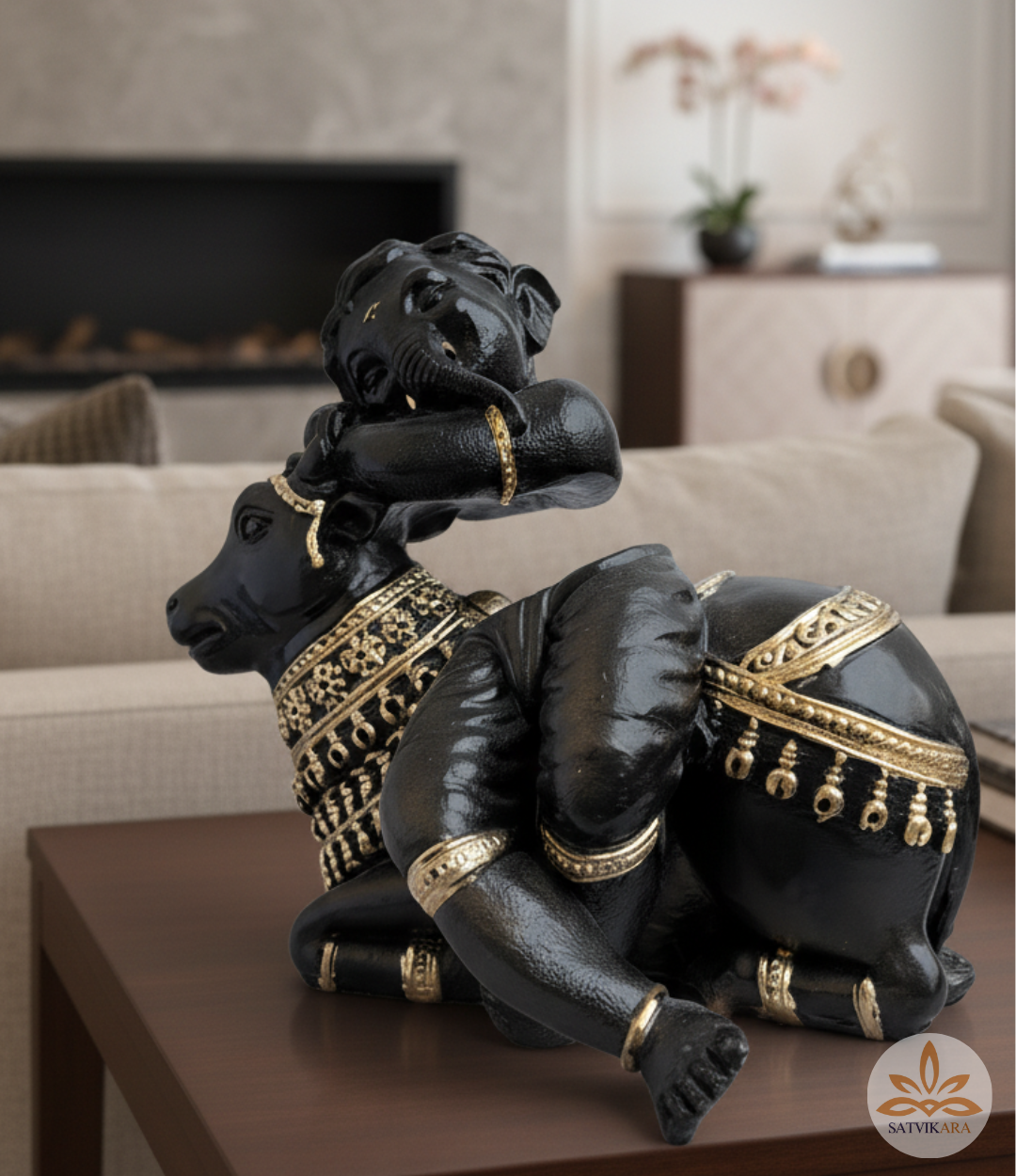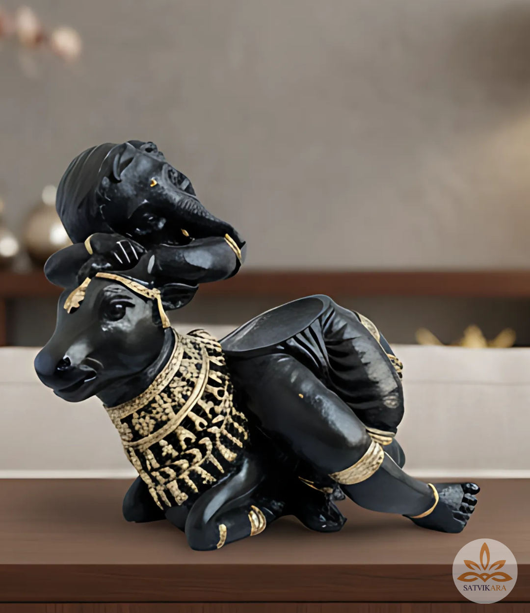 Bring blessings, peace, and prosperity to your home with the Satvikara Ganesh Resting on Nandi Idol. This unique design shows Lord Ganesh comfortably resting on Nandi, the sacred bull, symbolizing protection, wisdom, and devotion.